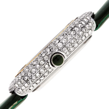 Yellow gold-tone brass set (all over) with Austrian crystals case with a green (patent) leather strap. Fixed yellow gold-tone brass bezel set with Austrian crystals. Green dial with yellow gold-tone dauphine hands. A single diamond is set at the 12 o'clock positions. Dot markers at the 3, 6 and 9 o'clock positions. Dial Type: Analog. Quartz movement. Scratch resistant mineral with hardened coating crystal. Fluted push/pull crown set with a green cabochon. Solid case back. Round case shape. Case size: 36 mm. Case thickness: 8 mm. Band width: 16 mm. Band length: 7 inches. Tang clasp. Water resistant at (30 meters/100 feet. Functions: basic three hand movement. Diamond Series. Dress watch style. Burgi Diamond Crystal Green Dial Green Leather Ladies Watch BUR199GN.