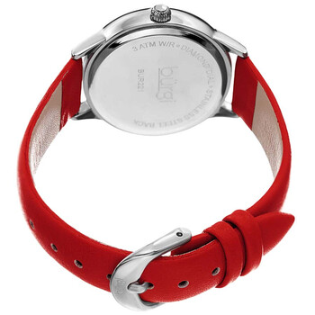 Silver-tone alloy case with a red leather strap. Fixed silver-tone alloy bezel set with crystals. White dial with silver-tone dauphine hands and index hour markers. Diamonds set at the 5, 8 and 12 o'clock positions. Dial Type: Analog. Quartz movement. Scratch resistant mineral with hardened coating crystal. Pull / push crown. Solid case back. Round case shape. Case size: 34 mm. Case thickness: 7.5 mm. Band width: 16 mm. Band length: 7 inches. Tang clasp. Water resistant at 30 meters / 100 feet. Functions: hour, minute, second. Diamond Series. Dress watch style. Burgi Diamond White Dial Red Leather Ladies Watch BUR221RD.