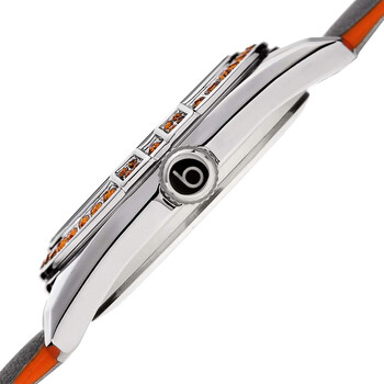 Silver-tone alloy case with a grey leather (orange edges) strap. Fixed silver-tone alloy bezel set with orange crystals. Grey dial with silver-tone sword hands and Arabic numeral hour markers. Minute markers around an inner ring. Dial Type: Analog. Quartz movement. Scratch resistant flat mineral crystal. Pull / push crown. Solid case back. Round case shape. Case size: 36 mm. Case thickness: 9.5 mm. Band width: 18 mm. Band length: 7.5 inches. Tang clasp. Water resistant at 30 meters / 100 feet. Functions: hour, minute, second. Crystal Series. Dress watch style. Burgi Grey Dial Grey Leather Ladies Watch BUR206GY.
