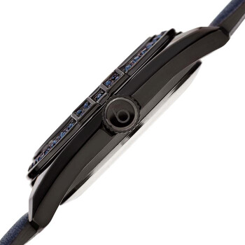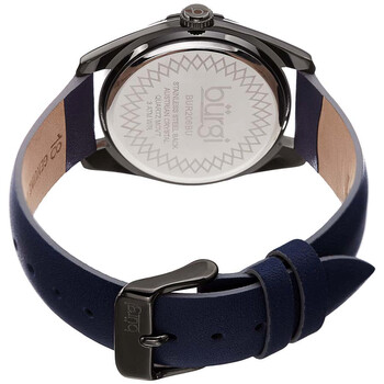 Black alloy case with a blue leather strap. Fixed black alloy bezel set crystals. Gunmetal grey dial with silver-tone sword hands and Roman numeral hour markers. Minute markers around an inner ring. Dial Type: Analog. Quartz movement. Scratch resistant flat mineral crystal. Push / pull crown. Solid case back. Round case shape. Case size: 36 mm. Case thickness: 9.5 mm. Band width: 18 mm. Band length: 7.5 inches. Tang clasp. Water resistant at 30 meters / 100 feet. Functions: hour, minute, second. Casual watch style. Burgi Gunmetal Grey Dials Blue Leather Ladies Watch BUR206BU.
