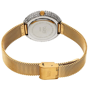 Gold-tone brass with 221 swarovski crystals case with a gold-tone stainless steel mesh bracelet. Fixed gold-tone brass bezel. White dial with dauphine style hands and diamond and applied dots hour markers. Dial Type: Analog. Quartz movement. Scratch resistant mineral crystal crystal. Push/pull fluted crown with cabochon crown. Solid case back. Round case shape, case size: 36 mm, case thickness: 7.5 mm. Band width: 16 mm, band length: 7.25 inches. Sliding clasp. Water resistant at 30 meters / 100 feet. Functions: classic three hand movement. Dress watch style. Burgi Ladies Argyle Dial Swarovski Crystal Glamor Mesh Bracelet Watch.