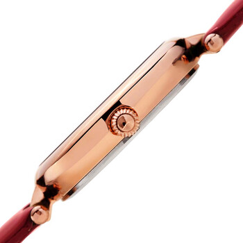 Rose gold-tone polished finish alloy case with a red (patent) leather strap. Fixed rose gold-tone polished alloy bezel. Red dial with leaf style hands. Arabic numerals appear at the 6 and 12 o'clock p[ositions. Diamond dots mark the 3 and 9 o'clock positions. Dial Type: Analog. Quartz movement. Scratch resistant mineral crystal with a hardened coating. Push/pull fluted crown crown. Solid case back. Round case shape. Case size: 34 mm. Case thickness: 7.5 mm. Band width: 13 mm, band length: 7 inches. Tang clasp. Water resistant at 30 meters / 100 feet. Functions: classic three hand movement. Dress watch style. Burgi Ladies Engraved Argyle Diamond Dial Genuine Leather Strap Watch.