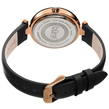Rose gold-tone alloy case with a black leather strap. Fixed rose gold-tone alloy bezel. Black ombre (glitter) dial with rose gold-tone hands and Swarovski stone hour markers. Dial Type: Analog. Quartz movement. Scratch resistant mineral with a hardened coating crystal. Fluted push / pull crown. Solid case back. Round case shape. Case size: 34 mm. Case thickness: 8 mm. Band width: 14 mm. Band length: 7 inches. Tang clasp. Water resistant at 30 meters / 100 feet. Functions: classic three hand movement. Dress watch style. Burgi Ladies Glitter Ombre Swarovski Crystal Dial Black Leather Strap Watch.