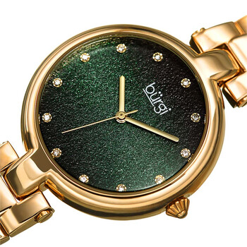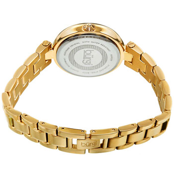 Gold-tone polished finish alloy case with a gold-tone stainless steel bracelet. Fixed gold-tone polished alloy bezel. Green glitter dial withgold-tone hands and crystal hour markers. Dial Type: Analog. Quartz movement. Scratch resistant mineral crystal with hardened coating crystal. Push/pull fluted crown crown. Solid case back. Round case shape. Case size: 34 mm. Case thickness: 8 mm. Band width: 14 mm. Band length: 7.5 inches. Jewelry clasp. Water resistant at 30 meters / 100 feet. Functions: classic three hand movement. Dress watch style. Burgi Ladies Glitter Ombre Swarovski Crystal Dial Bracelet Watch.