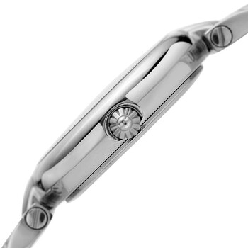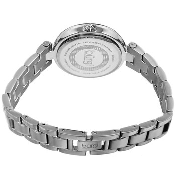 Silver-tone alloy case with a stainless steel bracelet. Fixed silver-tone alloy bezel. Pink glitter dial with silver-tone hands and Swarovski crystal hour markers. Dial Type: Analog. Quartz movement. Scratch resistant mineral with hardened coating crystal. Fluted push / pull crown. Solid case back. Round case shape. Case size: 34 mm. Case thickness: 8 mm. Band width: 14 mm. Band length: 7.5 inches. Jewelry clasp. Water resistant at (30 meters/100 feet. Functions: classic three hand movement. Crystal Series. Dress watch style. Burgi Ladies Glitter Ombre Swarovski Crystal Dial Bracelet Watch.