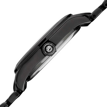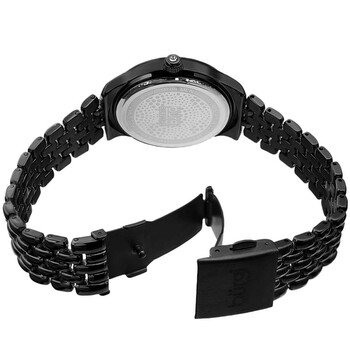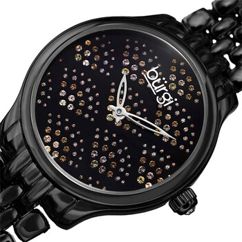 Black alloy case with a black polished alloy bracelet. Fixed black polished alloy bezel. Black dial with skeletonized leaf style hands. No markers. Dial Type: Analog. Quartz movement. Scratch resistant mineral crystal with hardened coating crystal. Push/pull fluted with clear swarovski crysta crown. Solid case back. Round case shape. Case size: 36 mm. Case thickness: 10 mm. Band width: 16 mm. Band length: 8.25 inches. Fold over clasp with a push button release. Water resistant at 30 meters / 100 feet. Functions: classic 2 hand movement. Dress watch style. Burgi Ladies Swarovski Crystal Pebble Style Bracelet Watch.