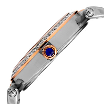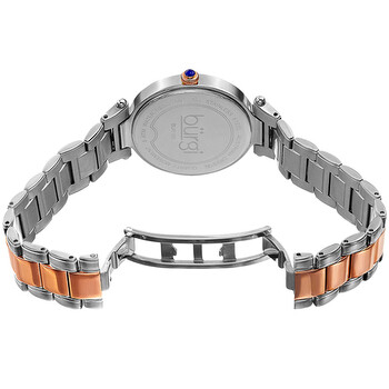 Stainless steel case with a two-tone (silver-tone and rose gold-tone) stainless steel bracelet. Fixed rose gold-tone bezel set with Swarovski crystals. Mother of pearl (diamond-cut) dial with rose gold-tone hands and Roman numeral hour markers. Minute markers around the outer rim. Dial Type: Analog. Date display at the 6 o'clock position. Quartz movement. Scratch resistant mineral crystal with a hardened coating. Pull / push crown. Solid case back. Round case shape. Case size: 35 mm. Case thickness: 9 mm. Band width: 20 mm. Fold over clasp. Water resistant at 50 meters / 165 feet. Functions: date, hour, minute, second. Casual watch style. Burgi Mother Of Pearl Dial Two-tone Ladies Watch BUR165TTR.