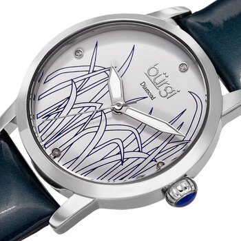 Silver-tone composite metal case with a blue leather strap. Fixed silver-tone composite metal bezel. White (reed design) dial with luminous silver-tone sword-shaped hands. Diamonds appear at the 3, 6, 9 and 12 o'clock positions. Dial Type: Analog. Luminescent hands. Quartz movement. Scratch resistant mineral crystal. Pull / push crown. Solid case back. Round case shape. Case size: 32 mm. case thickness: 8 mm. Band width: 15 mm. Band length: 7.25 inches. Tang clasp. Water resistant at 30 meters / 100 feet. Functions: hour, minute, second. Pattern Series. Fashion watch style. Burgi Pattern Quartz Diamond White Dial Ladies Watch BUR173BU.