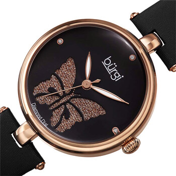 Rose gold-tone alloy case with a black smooth leather strap. Fixed rose gold-tone alloy bezel. Black (glitter butterfly cutout) dial with luminous rose gold-tone leaf-style hands. Diamonds set at the 3 and 9 o'clock positions. Dial Type: Analog. Luminescent hands. Quartz movement. Scratch resistant domed mineral crystal. Pull / push crown. Solid case back. Round case shape. Case size: 34 mm. Case thickness: 10 mm. Band width: 16 mm. Band length: 7.5 inches. Tang clasp. Water resistant at 30 meters / 100 feet. Functions: hour, minute, second. Pretty Butterfly Series. Casual watch style. Burgi Pretty Butterfly Diamond Black Dial Ladies Watch BUR233RGBK.