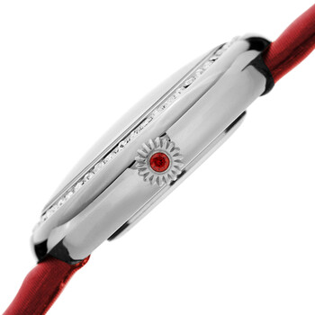Silver-tone composite metal case with a red (satin over) leather strap. Fixed silver-tone composite metal bezel set with Swarovski crystals. Beige mother of pearl (koi fish) dial with luminous silver-tone hands and crystal hour markers. Dial Type: Analog. Luminescent hands. Quartz movement. Scratch resistant mineral crystal. Pull / push crown. Solid case back. Round case shape. Case size: 38 mm. Case thickness: 8 mm. Band width: 18 mm. Band length: 7.25 inches. Tang clasp. Water resistant at 30 meters / 100 feet. Functions: hour, minute, second. Fashion watch style. Burgi Quartz Beige Koi Fish Dial Ladies Watch BUR188RD.