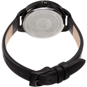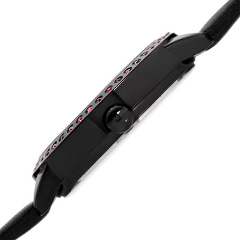 Black alloy case with a black leather strap. Fixed- black alloy bezel set with pink crystals. Black dial with silver-tone hands and pink crystal hour markers. Minute markers around the outer rim. Dial Type: Analog. Quartz movement. Scratch resistant mineral crystal. Pull / push crown. Solid case back. Round case shape. Case size: 35 mm. Case thickness: 8 mm. Band width: 12 mm. Band length: 7 inches. Tang clasp. Water resistant at 30 meters / 100 feet. Functions: hour, minute, second. Casual watch style. Burgi Quartz Crystal Black Dial Ladies Watch BUR161BK.