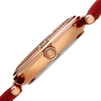 Rose gold-tone composite metal case with a red satin (leather back) strap. Fixed rose gold-tone composite metal set with (zircon) crystals bezel. White mother of pearl dial with rose gold-tone leaf-style hands and diamond hour markers. Arabic numerals mark the 3, 6, 9 and 12 o'clock positions. Dial Type: Analog. Quartz movement. Scratch resistant mineral crystal. Pull / push crown. Solid case back. Round case shape. Case size: 31 mm. Case thickness: 7.5 mm. Band width: 14 mm. Band length: 7.5 inches. Tang clasp. Water resistant at 30 meters / 100 feet. Functions: hour, minute, second. Fashion watch style. Burgi Quartz Crystal White Dial Red Satin Ladies Watch BUR251RD.
