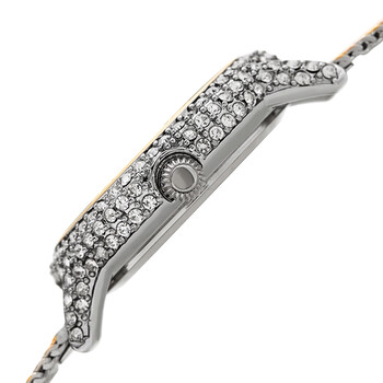 Gold-tone alloy case set (all over) with Swarovski crystals with a two-tone (silver-tone and gold-tone) stainless steel mesh bracelet. Fixed gold-tone alloy bezel set with Swarovski crystals. Black dial with gold-tone leaf-style hands. Diamonds mark the 3, 6, 9 and 12 o'clock positions. Dial Type: Analog. Quartz movement. Scratch resistant mineral crystal. Pull / push crown. Solid case back. Round case shape. Case size: 34 mm. Case thickness: 7 mm. Band width: 14 mm. Band length: 8.5 inches. Fold over slip through clasp. Water resistant at 30 meters / 100 feet. Functions: hour, minute, second. Fashion watch style. Burgi Quartz Diamond Black Dial Ladies Watch BUR250TTG.