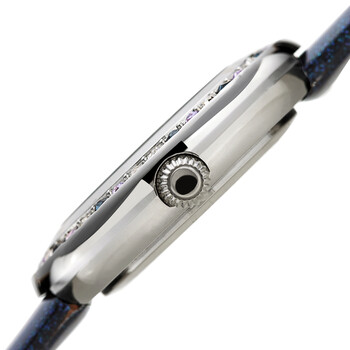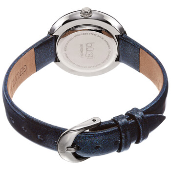 Silver-tone composite metal case with a blue polyurethane strap. Fixed silver-tone composite metal bezel set with crystals. Blue dial with silver-tone hands. A single diamond is set at the 12 o'clock position. Dot markers at the 3, 6, and 9 o'clock positions. Dial Type: Analog. Quartz movement. Scratch resistant Hardlex crystal. Pull / push crown. Solid case back. Round case shape. Case size: 33 mm. Case thickness: 7.5 mm. Band width: 14 mm. Band length: 7 inches. Tang clasp. Water resistant at 30 meters / 100 feet. Functions: hour, minute, second. Fashion watch style. Burgi Quartz Diamond Blue Dial Blue Polyurethane Ladies Watch BUR265BU.