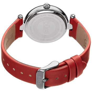 Silver-tone composite metal case with a satin covered (leather) strap. Fixed silver-tone composite metal bezel. Mother of pearl dial with luminous silver-tone leaf-style hands and dot hour markers. Diamonds mark the 3, 6. 9 and 12 o'clock positions. Dial Type: Analog. Luminescent hands. Quartz movement. Scratch resistant mineral crystal. Pull / push crown. Solid case back. Round case shape. Case size: 36 mm. Case thickness: 10 mm. Band width: 18 mm. Band length: 7 inches. Tang clasp. Water resistant at 30 meters / 100 feet. Functions: hour, minute, second. Fashion watch style. Burgi Quartz Diamond Mother of Pearl Dial Ladies Watch BUR169RD.