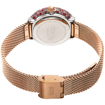 Rose gold-tone brass case with a rose gold-tone stainless steel mesh bracelet. Fixed rose gold-tone brass bezel set with multi-colored crystals. Silver dial with rose gold-tone leaf-style hands. A single diamond is set at the 12 o'clock position. Dot markers appear at the 3, 6 and 9 o'clcok positions. Dial Type: Analog. Quartz movement. Scratch resistant Hardlex crystal. Pull / push crown. Solid case back. Round case shape. Case size: 33 mm. Case thickness: 7.5 mm. Band width: 14 mm. Band length: 8 inches. Fold over slip through clasp. Water resistant at 30 meters / 100 feet. Functions: hour, minute, second. Fashion watch style. Burgi Quartz Diamond Silver Dial Ladies Watch BUR258RG.