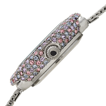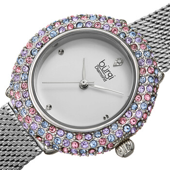 Silver-tone brass case with a stainless steel mesh bracelet. Fixed silver-tone brass bezel set with multi-colored Swarovski crystals. Silver dial with silver-tone hands. A single diamond is set at the 12 o'clock position. Dots appear at the 3, 6 and 9 o'clock position. Dial Type: Analog. Quartz movement. Scratch resistant mineral crystal. Pull / push crown. Solid case back. Round case shape. Case size: 33 mm. Case thickness: 7.5 mm. Band width: 14 mm. Band length: 8 inches. Fold over slip through clasp. Water resistant at 30 meters / 100 feet. Functions: hour, minute, second. Fashion watch style. Burgi Quartz Diamond Silver Dial Ladies Watch BUR258SSPK.
