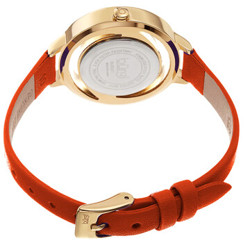 Gold-tone composite metal case with a orange leather strap. Fixed gold-tone composite metal bezel set with Swarovski crystals. Silver dial with gold-tone hands. Diamonds set at the 3, 6, 9 and 12 o'clock positions. Dial Type: Analog. Quartz movement. Scratch resistant Hardlex crystal. Pull / push crown. Solid case back. Round case shape. Case size: 32 mm. Case thickness: 7.6 mm. Tang clasp. Water resistant at 30 meters / 100 feet. Functions: hour, minute, second. Casual watch style. Burgi Quartz Diamond Silver Dial Ladies Watch BUR261OR.