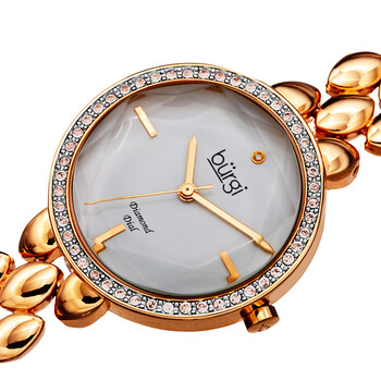 Rose gold-tone composite metal case with a rose gold-tone alloy bracelet. Fixed rose gold-tone composite metal bezel set with Swarovski crystals. White dial with gold-tone hands. Index markers at the 3, 6 and 9 o'clock positions. A single diamond is set at the 12 o'clock position. Dial Type: Analog. Quartz movement. Scratch resistant mineral crystal. Pull / push crown. Solid case back. Round case shape. Case size: 32 mm. Case thickness: 10 mm. Band width: 14 mm. Band length: 7.5 inches. Jewelry clasp. Water resistant at 30 meters / 100 feet. Functions: hour, minute, second. Fashion watch style. Burgi Quartz Diamond White Dial Rose Gold-tone Ladies Watch BUR242RG.