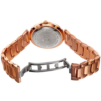 Rose gold-tone composite metal case with a rose gold-tone alloy bracelet. Swarovski crystal set lugs. Fixed rose gold-tone composite metal bezel set with Swarovski crystals. White mother of pearl dial with rose gold-tone hands and diamond hour markers. Dial Type: Analog. Quartz movement. Scratch resistant mineral crystal. Pull / push crown. Solid case back. Round case shape. Case size: 38 mm. Case thickness: 11 mm. Band width: 19 mm. Band length: 7 inches. Butterfly clasp. Water resistant at 30 meters / 100 feet. Functions: hour, minute, second. Fashion watch style. Burgi Quartz Diamond White Mother of Pearl Dial Ladies Watch BUR181RG.