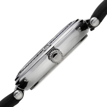Silver-tone composite metal case with a black leather strap. Fixed silver-tone composite metal bezel set with ombra crystals. White (mother of pearl) dial with silver-tone leaf-style hands and crystal hour markers. Arabic numerals mark the 3, 6, 9 and 12 o'clock positions. Dial Type: Analog. Quartz movement. Scratch resistant mineral crystal. Pull / push crown. Solid case back. Round case shape. Case size: 31 mm. Case thickness: 7.5 mm. Band width: 14 mm. Band length: 7.5 inches. Tang clasp. Water resistant at 30 meters / 100 feet. Functions: hour, minute, second. Fashion watch style. Burgi Quartz White Dial Black Leather Ladies Watch BUR251BK.