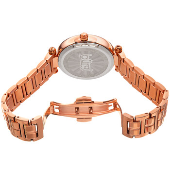 Rose gold-tone composite metal case with a rose gold-tone stainless steel bracelet. Fixed rose gold-tone composite metal bezel set with crystals. White mother of pearl dial with luminous rose gold-tone leaf-style hands. Crystals set at the 3, 6, 9 and 12 o'clock positions. Dial Type: Analog. Luminescent hands. Quartz movement. Scratch resistant mineral crystal. Pull / push crown. Solid case back. Round case shape. Case size: 36 mm. Case thickness: 7.5 mm. Band width: 16 mm. Band length: 8 inches. Butterfly clasp. Water resistant at 30 meters / 100 feet. Functions: hour, minute, second. Fashion watch style. Burgi Quartz White Mother of Pearl Dial Ladies Watch BUR183RG.