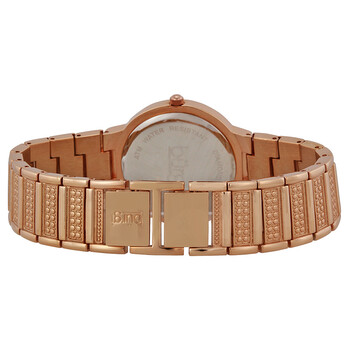 Rose gold-tone brass case with a rose gold-tone brass bracelet. Brass, rose-tone, crystals bezel. White mother of pearl dial with rose-tone hands and diamonds and crystals hour markers. Dial Type: Analog. Japanese quartz movement. Scratch resistant mineral crystal. Push/pull crown. Snap-down case back. Case diameter: 33.8 mm. Case thickness: 8.6 mm. Round case shape. Band width: 17.6 mm. Band length: 7.5 inches. Jewelry clasp. Water resistant at 10 meters (33 feet). Functions: hour, minute, second. Watch label: Hong Kong. Burgi Rose gold-tone brass Ladies Watch BUR067RG.