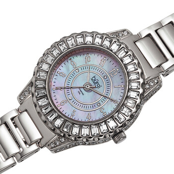 Silver-tone brass case set with (all over) crystals with a silver-tone brass bracelet. Fixed silver-tone brass bezel set with baguette crystals. Mother of pearl dial with silver-tone hands and Arabic numeral hour markers. Diamonds set at the 3, 6, 9 and 12 o'clock positions. Minute markers around the outer rim. Dial Type: Analog. Quartz movement. Scratch resistant mineral crystal. Pull / push crown. Snap down case back. Round case shape. Case size: 32 mm. Case thickness: 9 mm. Band width: 14 mm. Band length: 7.5 inches. Fold over clasp. Water resistant at 10 meters / 33 feet. Functions: hour, minute, second. Casual watch style. Watch label: Hong Kong. Burgi Silver-Tone Brass Mother of Pearl Dial Diamond Ladies Watch BUR095SS.