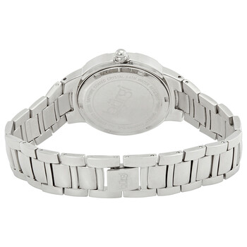 Stainless steel case with a stainless steel bracelet. Fixed silver-tone bezel set with crystals. Pink mother of pearl dial with silver-tone hands and diamond hour markers. Minute markers around the outer rim. Dial Type: Analog. Quartz movement. Scratch resistant mineral crystal. Pull / push crown. Screw down case back. Case diameter: 36 mm. Case thickness: 8 mm. Round case shape. Band width: 17 mm. Band length: 8.5 inches. Jewelry clasp. Water resistant at 50 meters / 165 feet. Functions: hour, minute, second. Casual watch style. Watch label: Hong Kong. Burgi Silver-Tone Steel Pink Mother of Pearl Diamond Dial Ladies Watch BUR093PK.