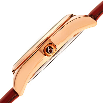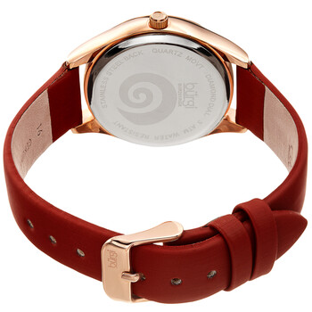 Rose gold-tone composite metal case with a red leather strap. Fixed rose gold-tone composite metal bezel. Red (crystal powder swirl) dial with luminous rose gold-tone leaf-style hands. Diamonds set at the 3, 9 and 12 o'clock positions. Dial Type: Analog. Luminescent hands. Quartz movement. Scratch resistant mineral crystal. Pull / push crown. Solid case back. Round case shape. Case size: 34 mm. Case thickness: 10 mm. Band width: 16 mm. Band length: 7 inches. Tang clasp. Water resistant at 30 meters / 100 feet. Functions: hour, minute. Swirl Series. Fashion watch style. Burgi Swirl Quartz Diamond Red Dial Ladies Watch BUR201RGR.