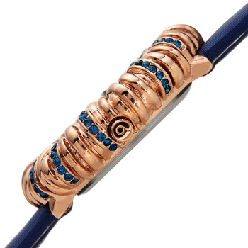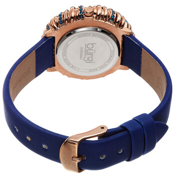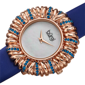 Gold-tone brass case with a blue leather strap. Fixed twisted gold-tone brass bezel with with multiple loops and set with vibrant colored Czech crystals. White mother of pearl dial with gold-tone dauphine-style hands. No markers. Dial Type: Analog. Quartz movement. Scratch resistant mineral crystal. Pull / push crown. Solid case back. Round case shape. Case size: 38 mm. Case thickness: 10 mm. Band width: 16 mm, band length: 8.5 inches. Tang clasp. Water resistant at 30 meters / 100 feet. Functions: hour, minute. Twisted Bezel Series. Fashion watch style. Burgi Twisted Bezel Quartz Crystal White Dial Ladies Watch BUR255BU.