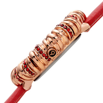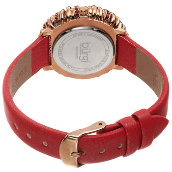 Gold-tone brass case with a red leather strap. Fixed gold-tone bezel with crystal set. White dial with gold-tone dauphine-style shape hands. Dial Type: Analog. Quartz movement. Scratch resistant mineral crystal. Pull / push crown. Solid case back. Round case shape, case size: 38 mm, case thickness: 10 mm. Band width: 16 mm, band length: 8.5 inches. Pin buckle clasp. Water resistant at 30 meters / 100 feet. Functions: hour, minute. Twisted Bezel Series. Fashion watch style. Burgi Twisted Bezel Quartz Crystal White Dial Ladies Watch BUR255RD.