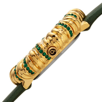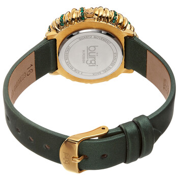 Gold-tone brass case with a green leather strap. Fixed gold-tone bezel with diamond set. White dial with gold-tone dauphine-style shape hands. Dial Type: Analog. Quartz movement. Scratch resistant mineral crystal. Pull / push crown. Solid case back. Round case shape, case size: 38 mm, case thickness: 10 mm. Band width: 16 mm, band length: 8.5 inches. Pin buckle clasp. Water resistant at 30 meters / 100 feet. Functions: hour, minute. Twisted Bezel Series. Fashion watch style. Burgi Twisted Bezel Quartz Diamond White Dial Ladies Watch BUR255GN.