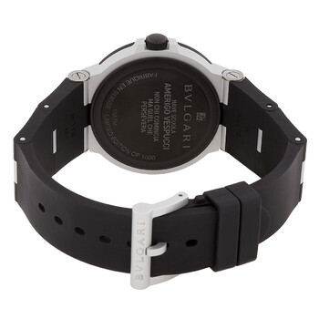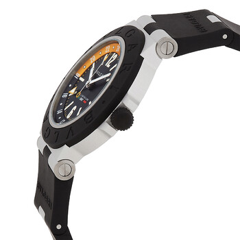 Silver-tone aluminum case with a black rubber strap. Fixed black rubber bezel. Black dial with silver-tone hands and index hour markers. Minute markers around the outer rim. Dial Type: Analog. Luminescent hands and markers. Date display at the 3 o'clock position. Bvlgari Calibre B192 automatic movement. Scratch resistant sapphire crystal. Solid case back. Round case shape, case size: 40 mm. Buckle clasp. Water resistant at 100 meters / 330 feet. Functions: GMT, second time zone, date, hour, minute, second. Additional Info: original box, international warranty card, manual (complete accessories). Aluminium Series. Luxury watch style. Watch label: Swiss Made. Bvlgari Aluminium Automatic Black Dial Men's Watch 103702.
