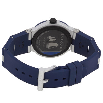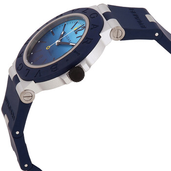 Grey titanium case with a blue rubber strap. Fixed blue rubber bezel. Blue dial with blue hands and index hour markers. Minute markers around the outer rim. Dial Type: Analog. Luminescent hands and markers. Date display at the 3 o'clock position. Bvlgari Calibre B77 Automatic movement, based upon ETA 2892, containing 21 Jewels, bitting at 28800 vph, and has a power reserve of approximately 42 hours. Scratch resistant sapphire crystal. Round case shape, case size: 40 mm. Buckle clasp. Water resistant at 100 meters / 330 feet. Functions: date, hour, minute, second. Additional Info: original box, international warranty card, manual (complete accessories). Aluminium Series. Luxury watch style. Watch label: Swiss Made. Bvlgari Aluminium Automatic Blue Dial Men's Watch 103815.