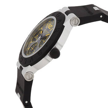 Silver-tone aluminum case with a black rubber strap. Fixed black rubber bezel. Grey dial with black hands and index hour markers. Minute markers around the outer rim. Dial Type: Analog. Luminescent hands and markers. Date display between 4 and 5 o'clock position. Chronograph - three sub-dials displaying: 60 second, 30 minute and 12 hour. Bvlgari Calibre B381 automatic movement. Scratch resistant sapphire crystal. Solid case back. Round case shape, case size: 41 mm. Buckle clasp. Water resistant at 100 meters / 330 feet. Functions: chronograph, date, hour, minute, second. Additional Info: original box, international warranty card, manual (complete accessories). Aluminium Series. Luxury watch style. Watch label: Swiss Made. Bvlgari Aluminium Chronograph Automatic Grey Dial Men's Watch 103893.