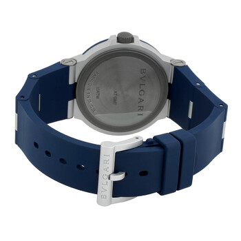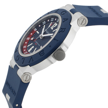 Aluminium case with a blue rubber strap. Fixed blue rubber bezel. Blue dial with luminous silver-tone hands and index hour markers. Arabic numerals appear at the 6 and 12 o'clock positions. Minute markers. 24 hour (GMT) markers around the outer rim. Dial Type: Analog. Luminescent hands and markers. Date display at the 3 o'clock position. Caliber B192 automatic movement with a 50-hour power reserve. Scratch resistant sapphire crystal. Solid case back. Round case shape. Case size: 40 mm. Tang clasp. Water resistant at 100 meters / 330 feet. Functions: GMT, second time zone, date, hour, minute, second. Additional Info: original box, manual (complete accessories). Aluminium Series. Luxury watch style. Watch label: Swiss Made. Bvlgari Aluminium Automatic Blue Dial Men's Watch 103554.