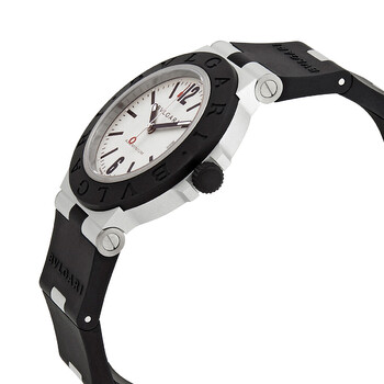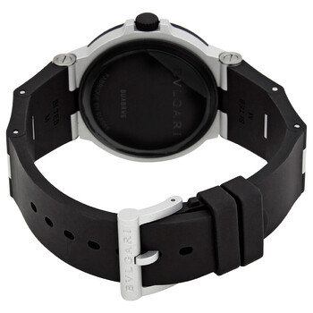 Grey aluminum case with a black rubber strap. Fixed black rubber bezel with Bvlgari Bvlgari engraved logo. Grey dial with luminous black hands and index hour markers. Arabic numerals appear at the 6 and 12 o'clock positions. Minute markers around the outer rim. Dial Type: Analog. Luminescent hands. Date display at the 3 o'clock position. Bvlgari calibre B77 automatic movement, based upon ETA 2892, containing 21 Jewels, bitting at 28800 vph, and has a power reserve of approximately 42 hours. Scratch resistant sapphire crystal. Transparent case back. Round case shape. Case size: 40 mm. Tang clasp. Water resistant at 100 meters / 330 feet. Functions: date, hour, minute, second. Aluminum Series. Luxury watch style. Watch label: Swiss Made. Bvlgari Aluminum Automatic Grey Dial Men's Watch 103382.