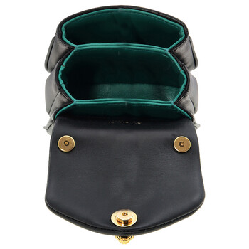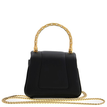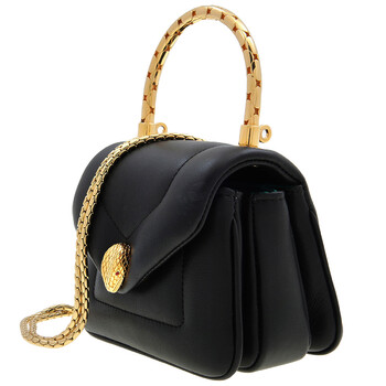Bvlgari Ladies Top Handle Bag. Serpenti Reverse series. SKU: 293106. Color: Black. Size: 4.5 x 3.7 x 2.8". Bvlgari Black Micro Serpenti Reverse Leather Top Handle Bag. This top-handle bag, crafted from Metropolitan calf leather, features a puffy, structured design with gold-plated brass hardware, a magnetic snakehead closure inspired by a 1960s Bvlgari watch, and a snake-shaped metallic top handle and chain strap, offering stylish functionality with three internal compartments, a card slot, and flap fastening to fit essentials. Material: Calf leather. Made in Italy.
