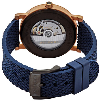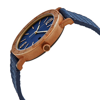 Bronze case with a blue rubber strap. Fixed bronze bezel. Blue dial with bronze hands and index hour markers. Arabic numerals appear at the 6 and 12 o'clock positions. Dial Type: Analog. Date display at the 3 o'clock position. Caliber BVL 191 automatic movement with a 42-hour power reserve. Scratch resistant sapphire crystal. Transparent case back. Round case shape. Case size: 41 mm. Tang clasp. Water resistant at 50 meters / 165 feet. Bvlgari-bvlgari Series. Luxury watch style. Watch label: Swiss Made. Bvlgari Bvlgari Automatic Blue Dial Men's Watch 103132.