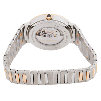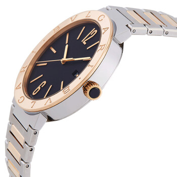 Stainless steel & 18k rose gold case with a brushed & polished stainless steel & 18k rose gold bracelet. Fixed 18k rose gold engraved with the bvlgari bvlgari logo bezel. Black dial with rose gold-tone hands and Arabic numeral at the 12 & 6 o'clock, index hour markers. Dial Type: Analog. Date display at the 3 o'clock position. Caliber BVL 191 features: ceramic ball bearings automatic movement with a 42-hour power reserve. Anti-reflective scratch resistant sapphire crystal. Transparent case back. Round case shape, case size: 41 mm. Push button folding clasp. Water resistant at 30 meters / 100 feet. Functions: date, hour, minute, second. Bvlgari Bvlgari Series. Luxury watch style. Watch label: Swiss Made. Bvlgari BVLGARI BVLGARI Automatic Black Dial Men's Watch 102930.