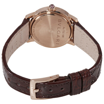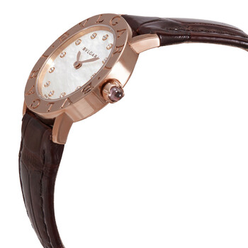 18kt rose gold case with a brown (alligator) leather strap. Fixed 18kt rose gold bezel. White mother of pearl dial with rose gold hands and diamond hour markers. Dial Type: Analog. Quartz movement. Scratch resistant sapphire crystal. Pull / push crown. Solid case back. Round case shape. Case size: 26 mm. Tang clasp. Water resistant at 30 meters / 100 feet. Functions: hour, minute. Bvlgari Series. Luxury watch style. Watch label: Swiss Made. Item Variations: BBLP26WGLC11/12. Bvlgari Bvlgari White Mother of Pearl Diamond Dial Ladies Watch 102751.