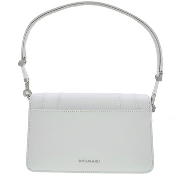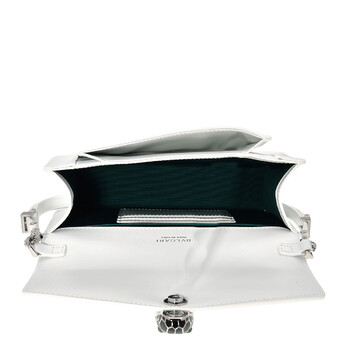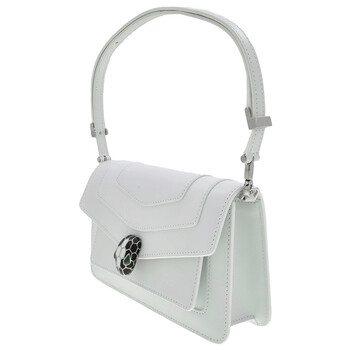 Bvlgari Ladies Shoulder Bag. Serpenti Forever series. SKU: 292104. Color: White. Size: 8.7" x 5.1" x 0.7". Bvlgari East-West Leather Serpenti Forever Shoulder Bag. This small shoulder bag, crafted from flash diamond white calf leather, features a practical leather strap and the iconic snakehead magnetic closure inspired by 1960s Serpenti jewels. Designed for everyday versatility, it includes a single compartment, a front pocket, a back patch pocket, an internal seam pocket, three card slots, a customisable mirror, and the Bvlgari metal logo on the back. Material: Calf leather. Made in Italy.