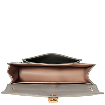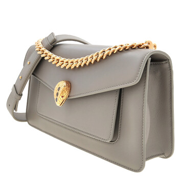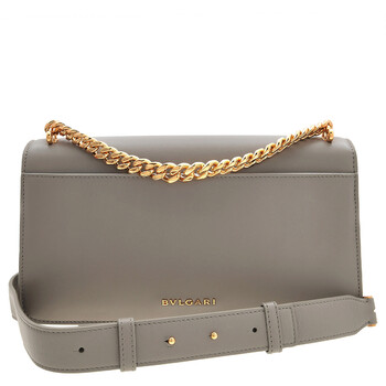 Bvlgari Ladies Crossbody. SKU: 292033. Color: Grey. Size: 11 x 5.7 x 2.5". Bvlgari Grey East-West Serpenti Shoulder Bag. The Serpenti shoulder bag, crafted from foggy opal grey Metropolitan calf leather, features a bold design with a heritage snakehead magnetic closure adorned with gemstones, inspired by a 1960s Bvlgari watch, and comes with a gold-plated brass chain handle, a removable and adjustable leather strap, multiple pockets, a customisable mirror, and the Bvlgari metal logo on the back. Material: Calf leather. Made in Italy.