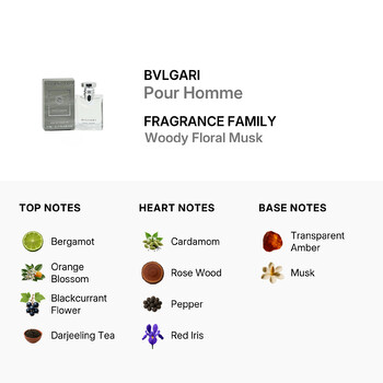 Bvlgari Pour Homme belongs to the Woody Floral Musk fragrance family, offering a clean yet complex aroma that’s both fresh and masculine. The scent opens with bright top notes of bergamot, orange blossom, blackcurrant flower, Darjeeling tea, water lily, and muguet. These refreshing notes awaken your senses and set the stage for a warm, spicy heart.