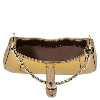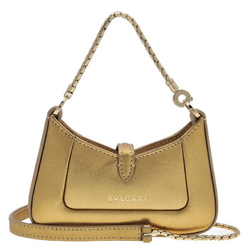 Bvlgari Ladies Shoulder Bag. Serpenti Bai series. SKU: 293828. Color: Gold. Size: 6.1 x 3.9 x 1". Bvlgari Mini Serpenti Baia Leather Shoulder Bag. Crafted in deep gold Striated calf leather, with a metallic and streaked effect, features a snakehead magnetic closure, detachable snake body-shaped chains for versatile wear, a light gold-plated brass hardware and a single compartment with refined details like a zipped top closure, an internal pocket, and a Bvlgari metal logo. Material: Calf leather. Made in Italy.