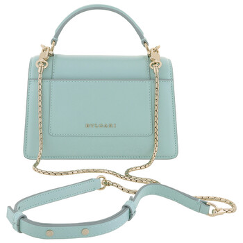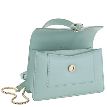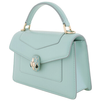 Bvlgari Ladies Top Handle Bag. Serpenti Forever series. SKU: 293666. Color: Light Blue. Size: 7.5 x 4.3 x 2.3". Bvlgari Mini Serpenti Forever Leather Top Handle Bag. This mini top handle bag in aquamarine calf leather features a snake body-shaped chain and leather strap, a '60s-inspired snakehead magnetic closure, a single compartment, light gold-plated brass hardware, multiple pockets, a customisable mirror, and the Bvlgari metal logo on the back. Material: Calf leather. Made in Italy.