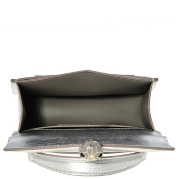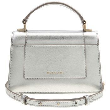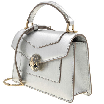 Bvlgari Ladies Top Handle Bag. SKU: 294102. Color: Silver. Size: 7.5 x 4.3 x 2.2". Bvlgari Mini Serpenti Forever Top Handle Bag In Silver. The Serpenti Forever mini top handle bag, crafted from silver Striated calf leather with a metallic, streaked effect reminiscent of rough diamonds, features a snake body-shaped chain and leather strap, and is adorned with the iconic snakehead magnetic closure inspired by Serpenti jewels from the '60s, with a single compartment, front and back patch pockets, an internal open. Material: Calf leather. Made in Italy.