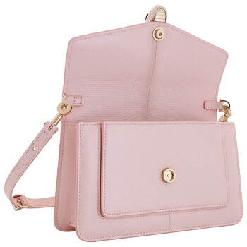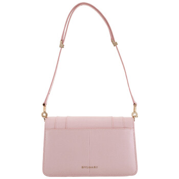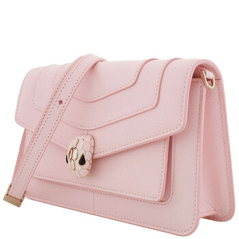Bvlgari Ladies Shoulder Bag. Serpenti Forever series. SKU: 294137. Color: Pink. Size: 8.7 x 5.1 x 0.7". Bvlgari Pink Serpenti Forever East-West Leather Shoulder Bag. The small shoulder bag, crafted in glossy light pink Pure Karung leather, features a practical strap, a magnetic snakehead closure inspired by 1960s Serpenti jewels, and a functional design with multiple pockets, card slots, a customisable mirror, and the Bvlgari logo on the back. Material: Karung leather. Made in Italy.
