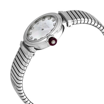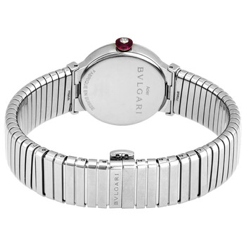 Stainless steel case with a stainless steel bracelet. Fixed stainless steel bezel. Mother of pearl dial with silver-tone hands and diamond hour markers. Dial Type: Analog. Quartz movement. Scratch resistant sapphire crystal. Pull / push crown set with a pink cabochon. Solid case back. Round case shape. Case size: 28 mm. Fold over clasp with a push button release. Water resistant at 50 meters / 165 feet. Functions: hour, minute. Dress watch style. Watch label: Swiss Made. Bvlgari Quartz Diamond Ladies Watch 103101.